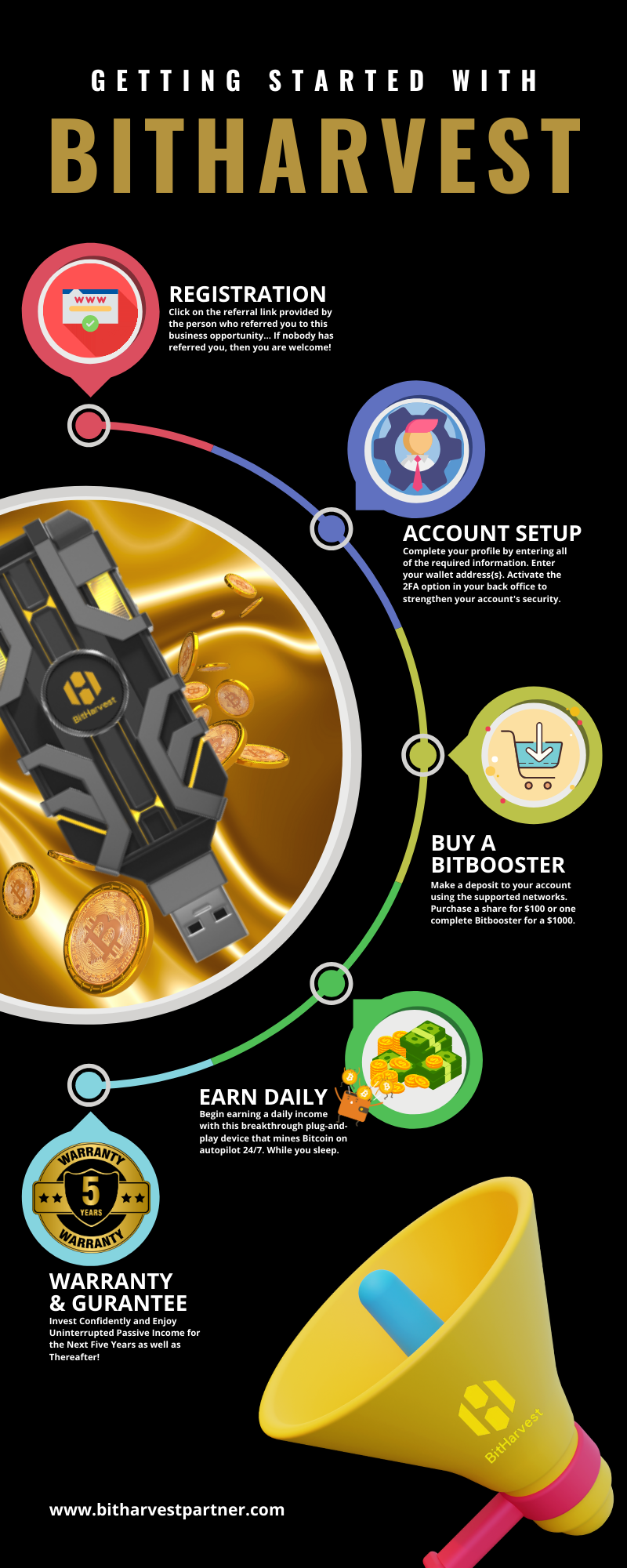 While BitHarvest aims to provide opportunities for passive income through its BitBooster device, individual results may vary. Earnings generated from Bitcoin mining depend on various factors, including market conditions and the performance of the technology.
